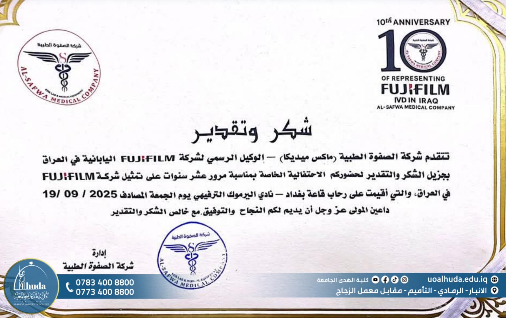 شارك التدريسي في قسم تقنيات المختبرات الطبية بـ كلية الهدى الجامعة، الدكتور سليم عبيد كاطع، في المؤتمر العلمي الذي نظمته شركة الصفوة الطبية (ماكس ميديكا) الوكيل الحصري لشركة FUJIFILM اليابانية، والذي أقيم على رحاب قاعة بغداد – نادي اليرموك الترفيهي، احتفاءً بمرور عشر سنوات على تمثيل الشركة في العراق.