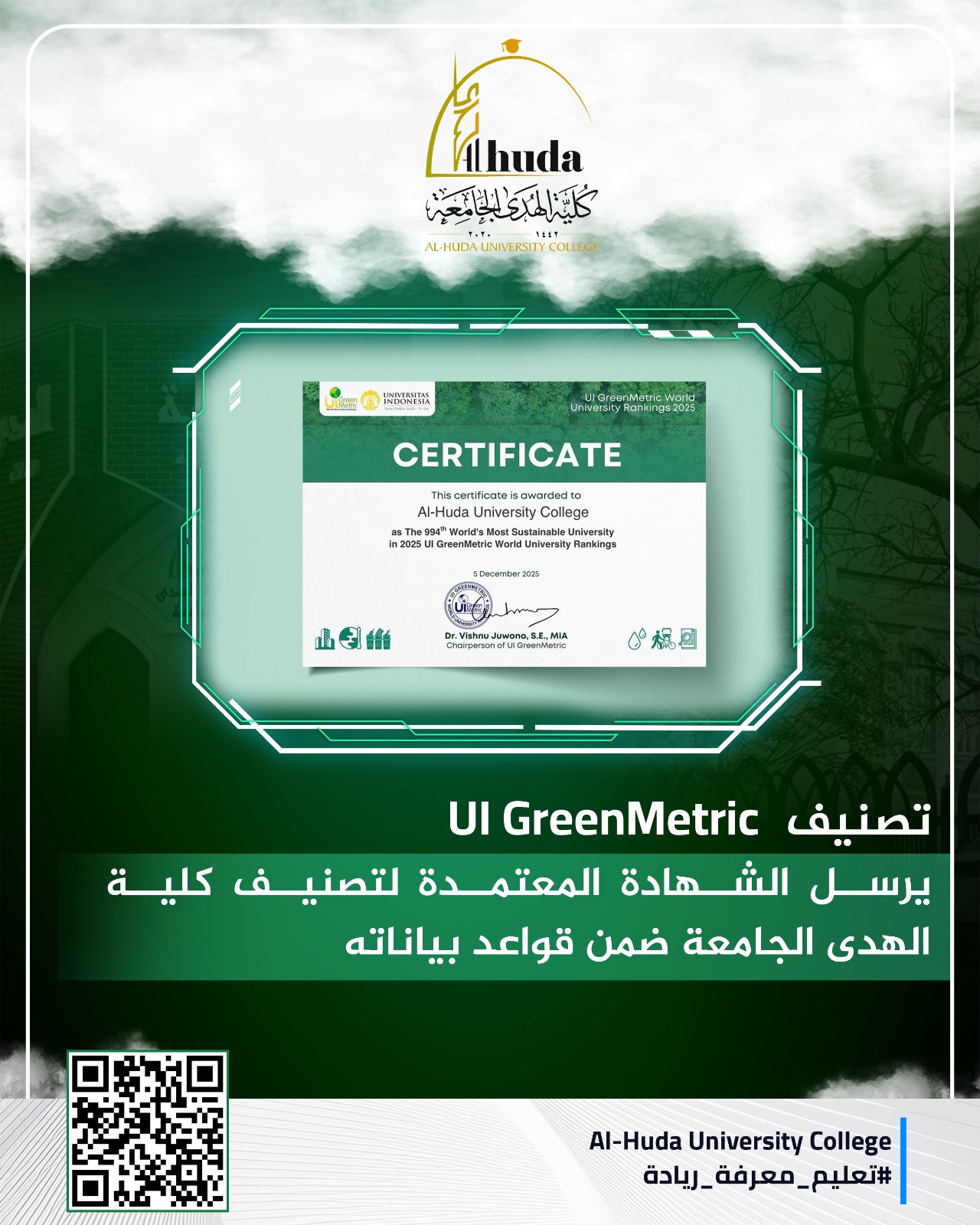 Al-Huda University College has received the official accredited certificate issued by the UI GreenMetric World University Rankings, confirming the college’s formal inclusion in the 2025 ranking database. This recognition comes as a result of the college’s successful fulfillment of internationally approved environmental sustainability standards and requirements.