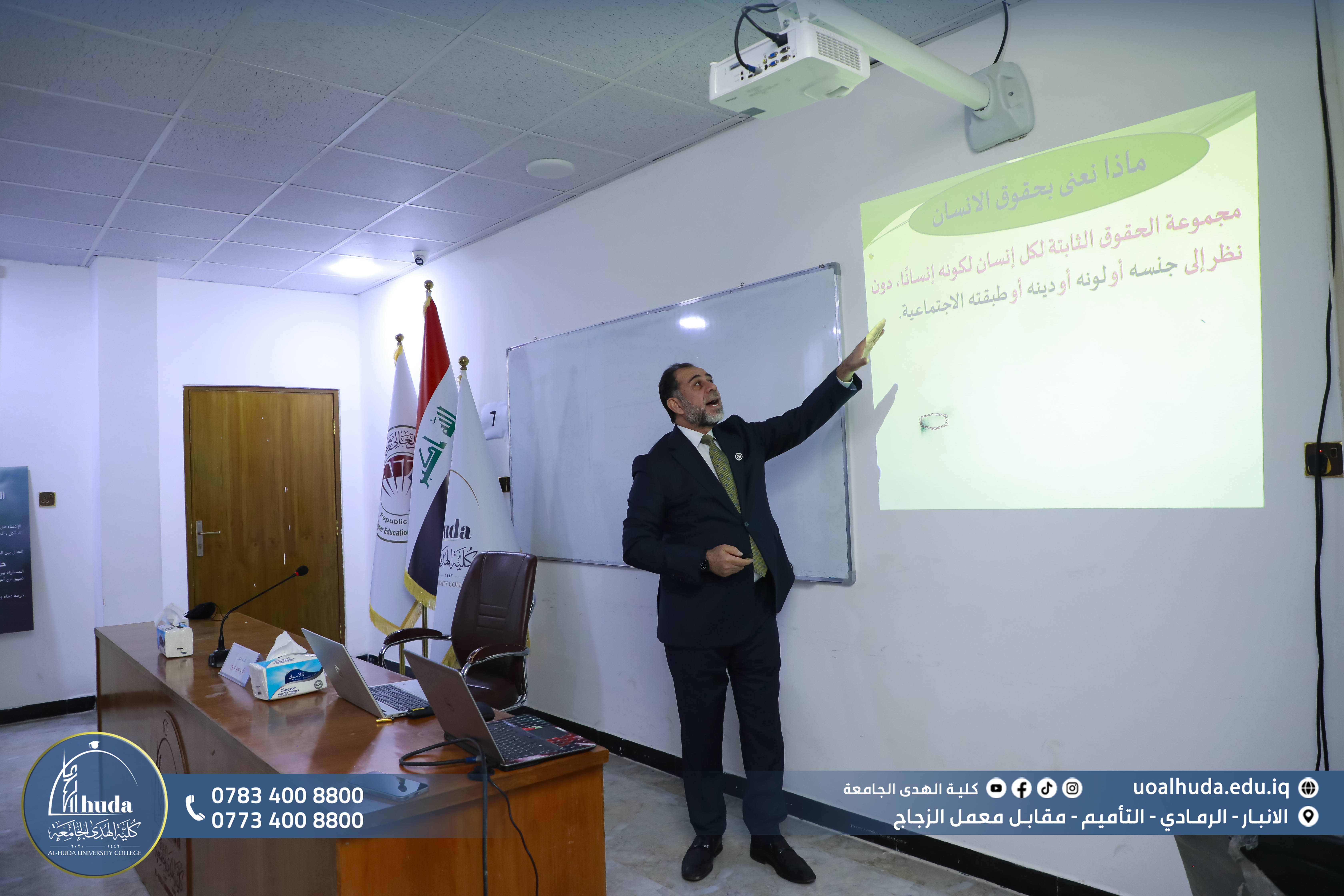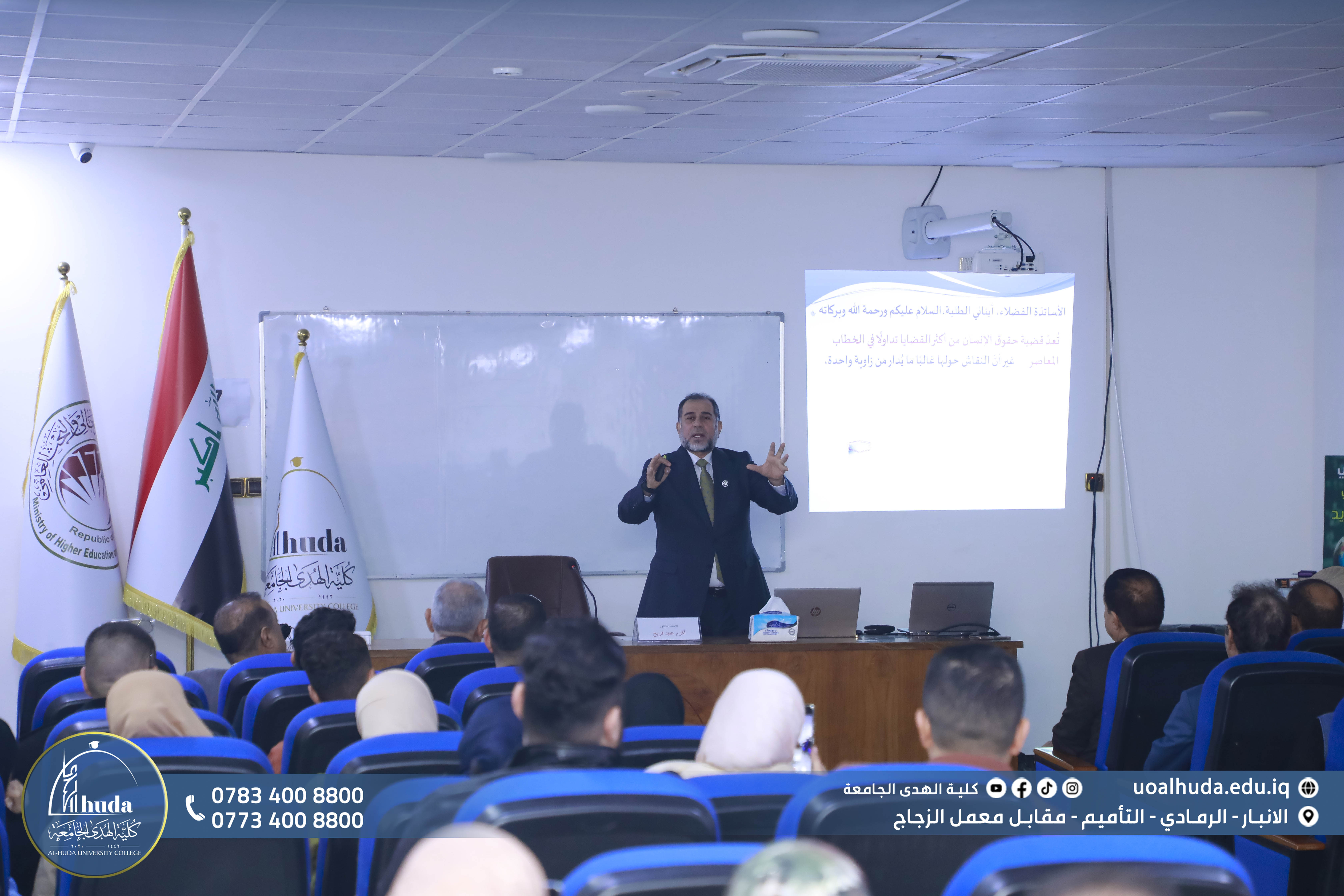 The seminar was delivered by Prof. Dr. Akram Ubaid Al-Alwani, who addressed the fundamental concepts of human rights and their significance in building societies. He emphasized the intrinsic value of the human being as the cornerstone of genuine development, and the necessity of investing in minds, knowledge, and the development of intellectual capacities rather than focusing on superficial appearances. He noted that such an approach has a direct impact on achieving sustainable progress and on consolidating the principles of justice and human dignity within society and the university environment.